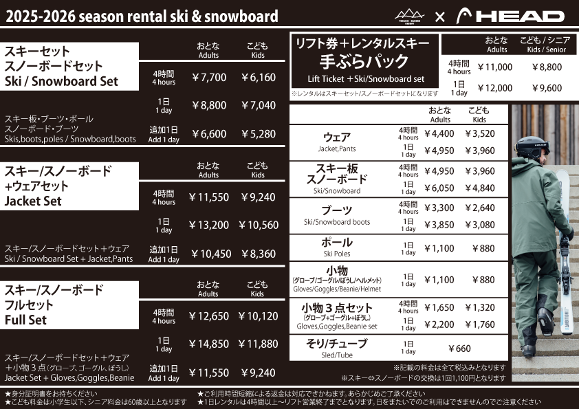 | 스키 / 스노 보드 세트 +웨어 | 9,240 | 10,560 | ¥8,360 |